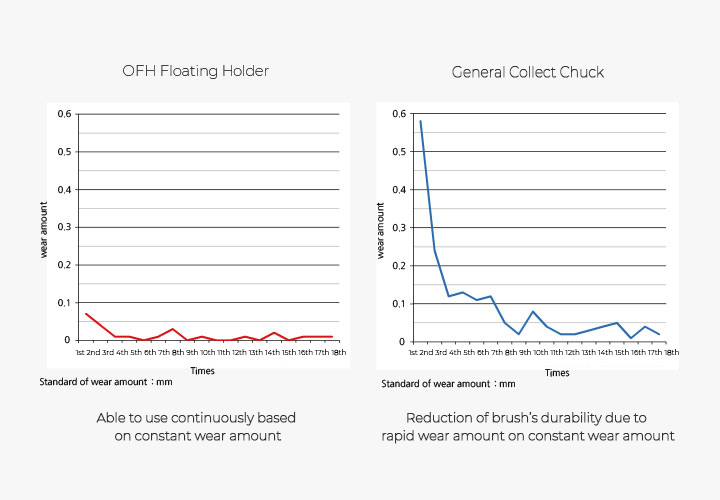 Compared to the use of floating holder (OFH), the general collet chuck caused by rapid brush wear during deburring to reduced brush tool life.
