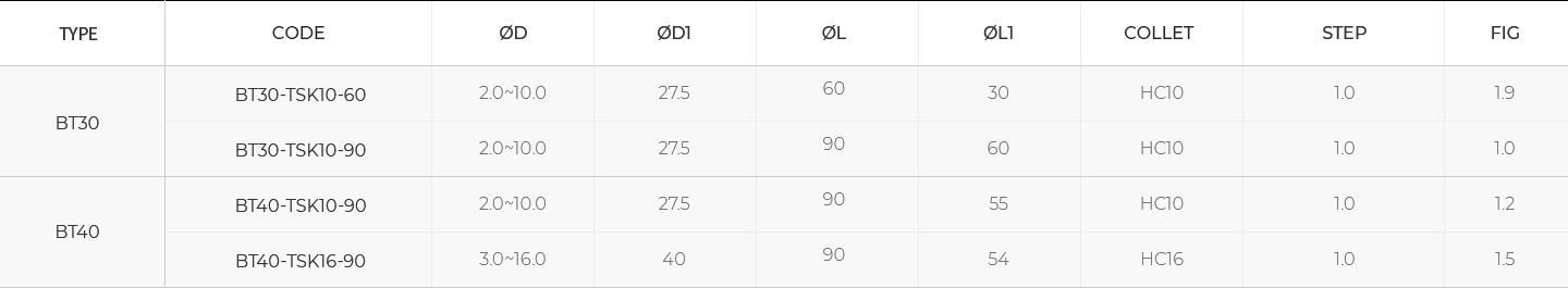ALL All products Chuck/Arbor VISE Other Products TSK_High speed slim type collet chuck High Speed Slim Type Collet Chuck List 3D DrawingCatalogue Taper Mas 403-BT Taper 25,000 Max RPM Coolant System (mm)