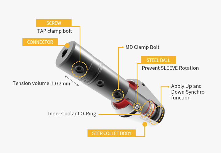By using a steel ball to prevent the sleeve from rotating, the load on the tool can be minimized and by equipping with top/bottom sync function to prevents tap breakage and improves tool life.
