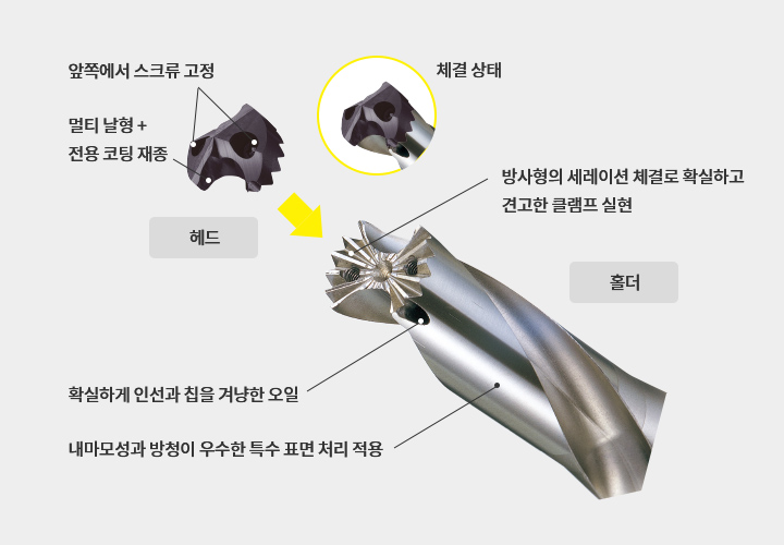 - 독자적인 방사형 세레이션 체결로 정밀도와 강도가 높은 헤드 교환 드릴입니다. 헤드 교환을 통해 항상 새 인선으로 사용할 수 있어 생산성 향상, 비용 절감 및 공구 관리 간소화에 기여합니다. 또한 재연마 영역을 1.5mm ~ 3mm 정도 확보하여 공구 비용의 절감이 가능합니다. ※ MTL 타입 / MEL 타입 / MB 타입만 재연마 가능