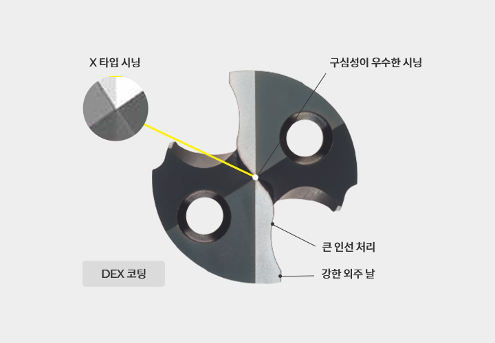 X 타입 시닝으로 절입 시 구심성이 우수하여 안정된 홀 가공을 실현.