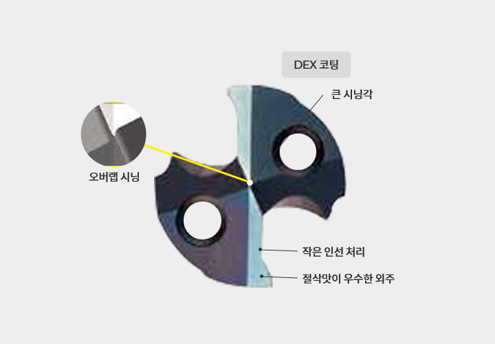 외주부의 절삭맛을 높여 주철의 홀 출구 엣지 치핑 발생을 방지합니다.