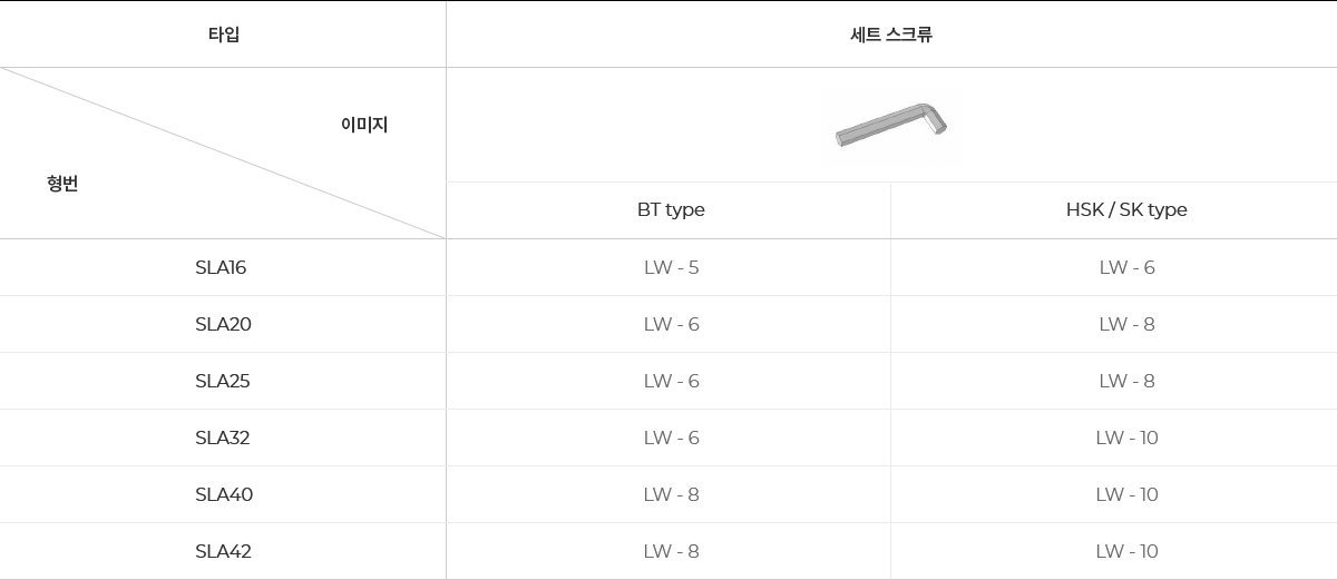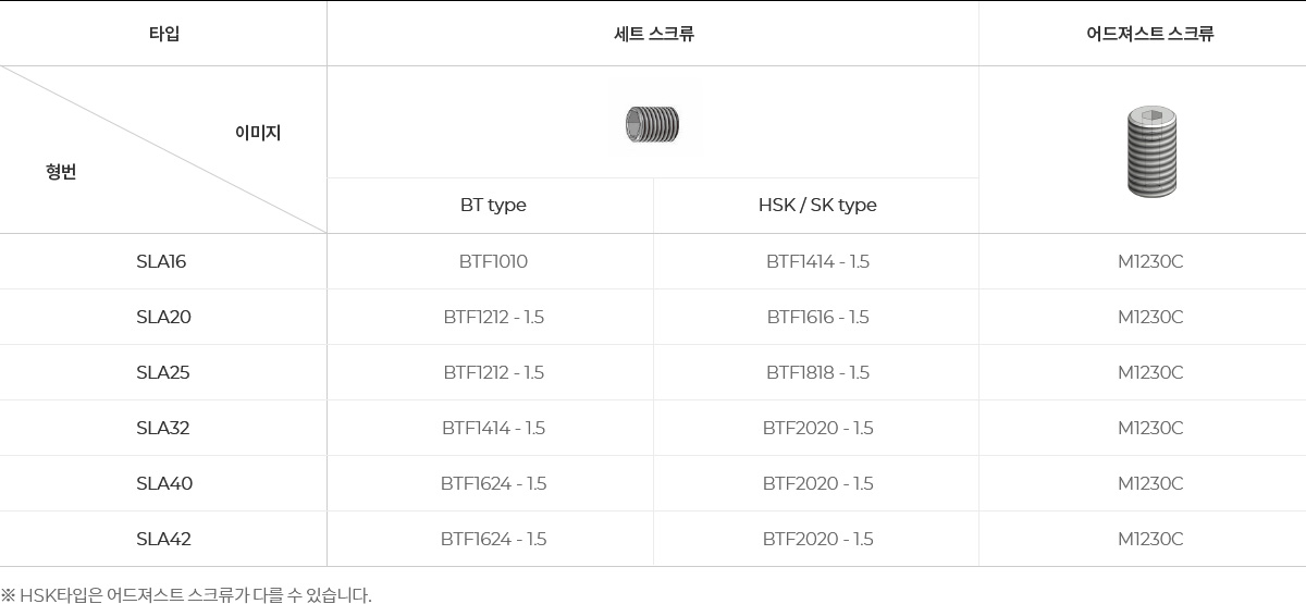 ALL 모든제품 CHUCK ARBOR BORING ANGULAR HEAD CBN/PCD ACCESSORY SLA_사이드 락 아바 Side lock arbor List 도면카탈로그 BT SHANK C내부 쿨런트 시스템이 탑재되어 있습니다. HSK SHANK C내부 쿨런트 시스템은 옵션 탑재 가능합니다. HSK Shank 별도구매품 내부 쿨런트 시스템 샹크별 구분 HSK50 HSK50A-CNS HSK63 HSK63A-CNS HSK100 HSK100A-CNS SK SHANK C내부 쿨런트 시스템이 탑재되어 있습니다. SLA SPARE PART 기본 구성품 별도 구성품