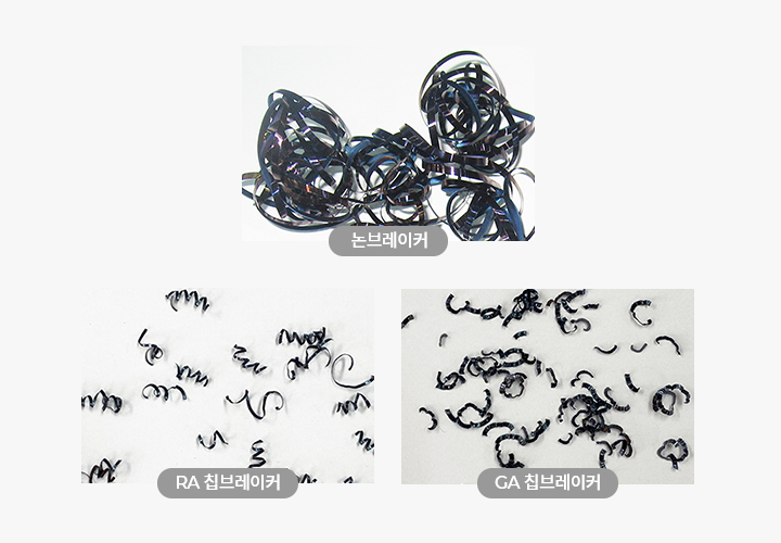 RA, GA 칩브레이커는 우수한 칩브레이킹 성능을 확보하여 가공 품질이 우수하고 무인 자동 운전 절삭에 적합합니다.
