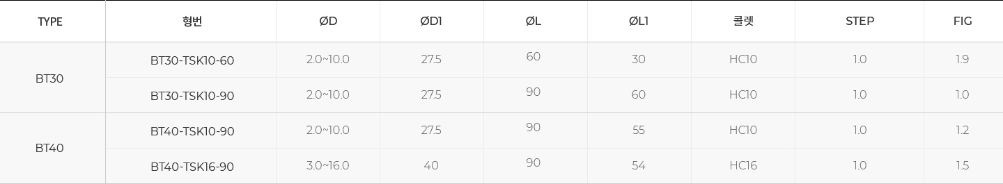 ALL 모든제품 Chuck/Arbor VISE Other Products TSK_고속 슬림 콜렛척 High Speed Slim Type Collet Chuck List 카탈로그 Shank Mas 403-BT Shank 25,000 Max RPM Coolant System (mm)