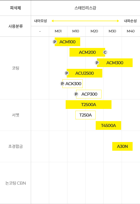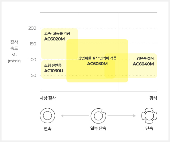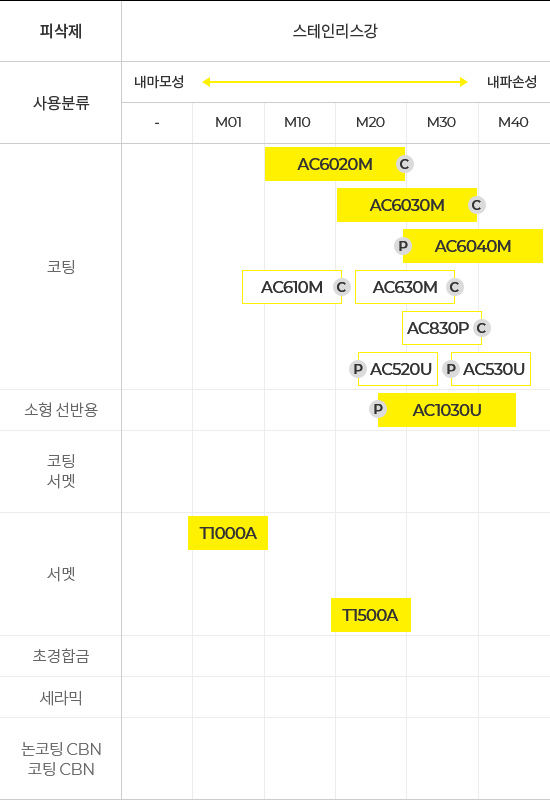ac6030m | 길고 안정된 가공을 실현하는 스테인리스강 선삭 가공의 제 1 추천 재종. 코팅막 강도의 향상과 우수한 밀착성에 의해 스테인리스강 가공에서 문제가 되는 이상 손상의 발생을 대폭 저감. |