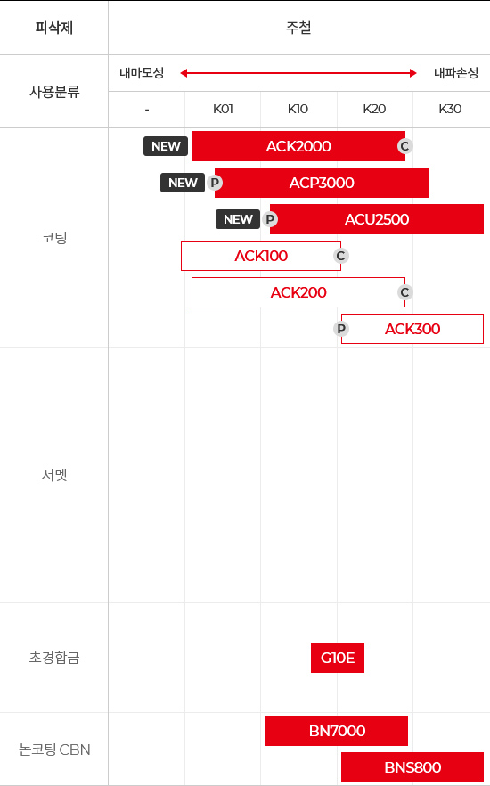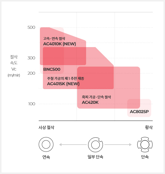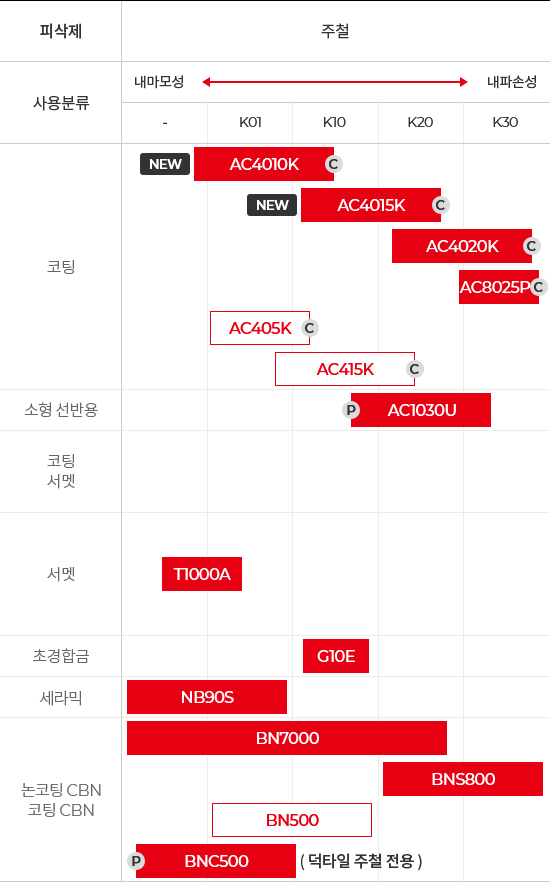 ac4015k 덕타일 주철의 제 1 추천 재종. 고밀착, 고강도 신 CVD 코팅으로 우수한 내마모성과 내치핑성 실현.