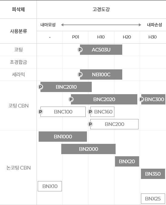 bn1000 | 논코팅 스미보론으로 내마모성이 가장 우수한 고속 가공용 재종. 내마모성을 중시하면서 내파손성을 개선. |