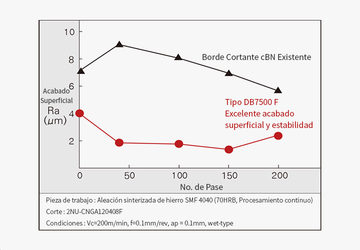 DB7500, un inserto no recubierto, puede mostrar una excelente resistencia al daño al aumentar la potencia de unión entre partículas CBN mediante la sinterización de la partícula intermedia cBN con alta densidad.