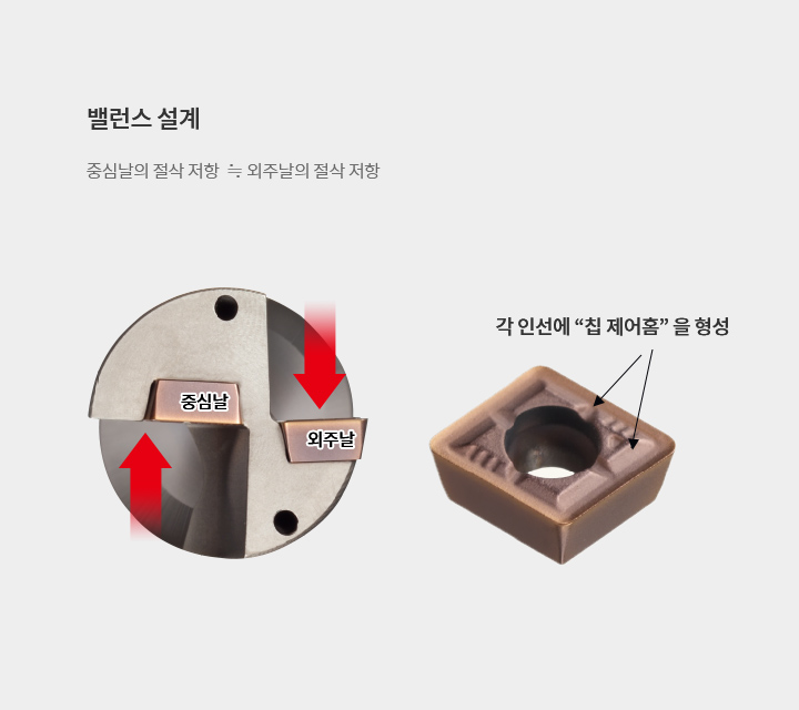 가공 시 절삭 저항이 중심날과 외주날에서 밸런스를 갖추도록 배치하고