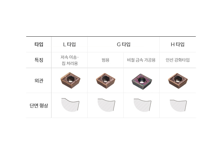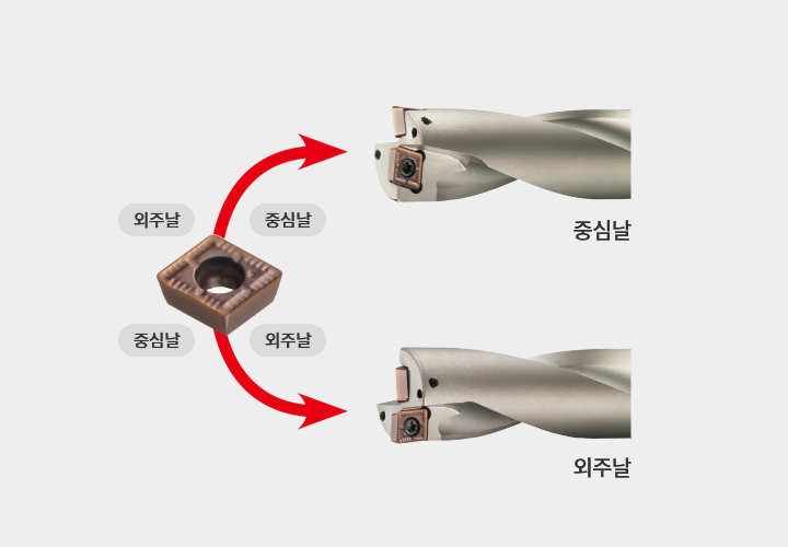중심날, 외주날 겸용 인서트를 적용하여 중심날 2코너, 외주날 2코너 등 총 4코너를 사용할 수 있어 경제성이 뛰어남.