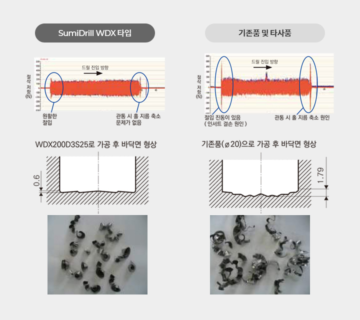 - SumiDrull WDX 타입은 우수한 절삭 밸런스를 갖춰 일반강에서 스테인리스강·알루미늄 합금에 이르기까지 피삭재를 가리지 않고 안정된 홀가공이 가능합니다. 또한 독창적인 3 종류의 칩 브레이커를 적용하여 칩 처리의 향상, 절삭 저항의 감소를 실현함으로써 강성이 낮은 가공 상황에서도 안심하고 사용할 수 있습니다.